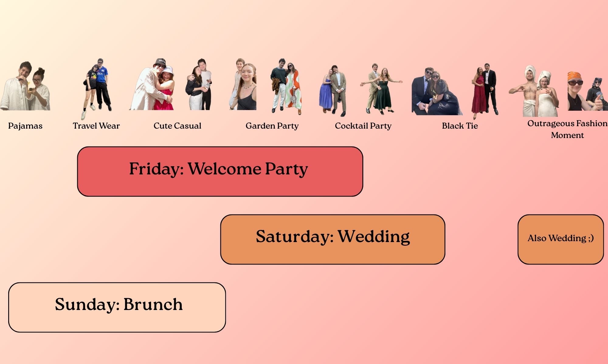 It might be hot, it might be cold! For Saturday, please no jeans unless you’re going for an incredible denim look. Any length of dress is fine, any choice of tie (or not) is fine. We will be dressing fancy (but never stuffy) and having fun with it (!!), and we would love if you did the same.